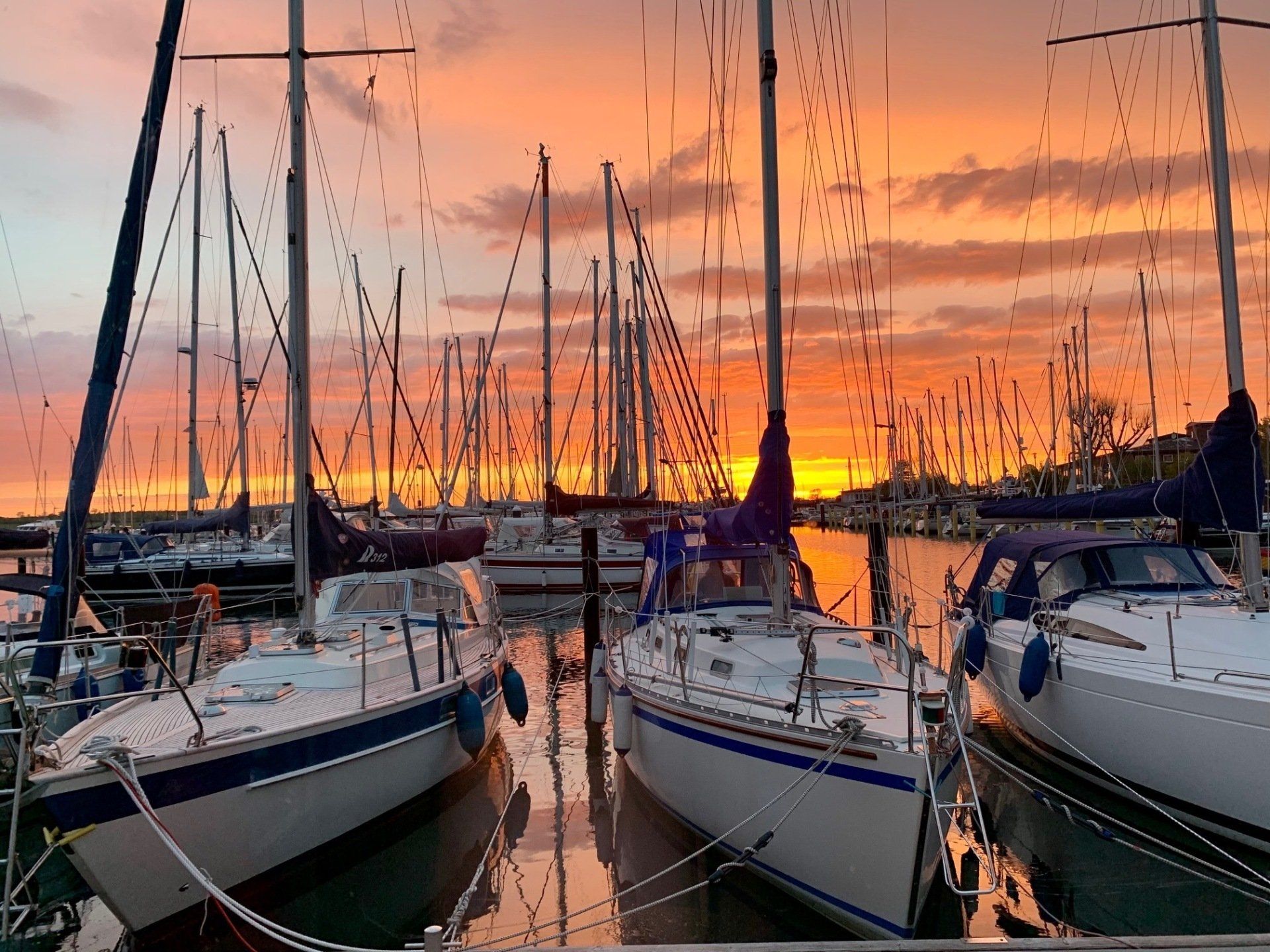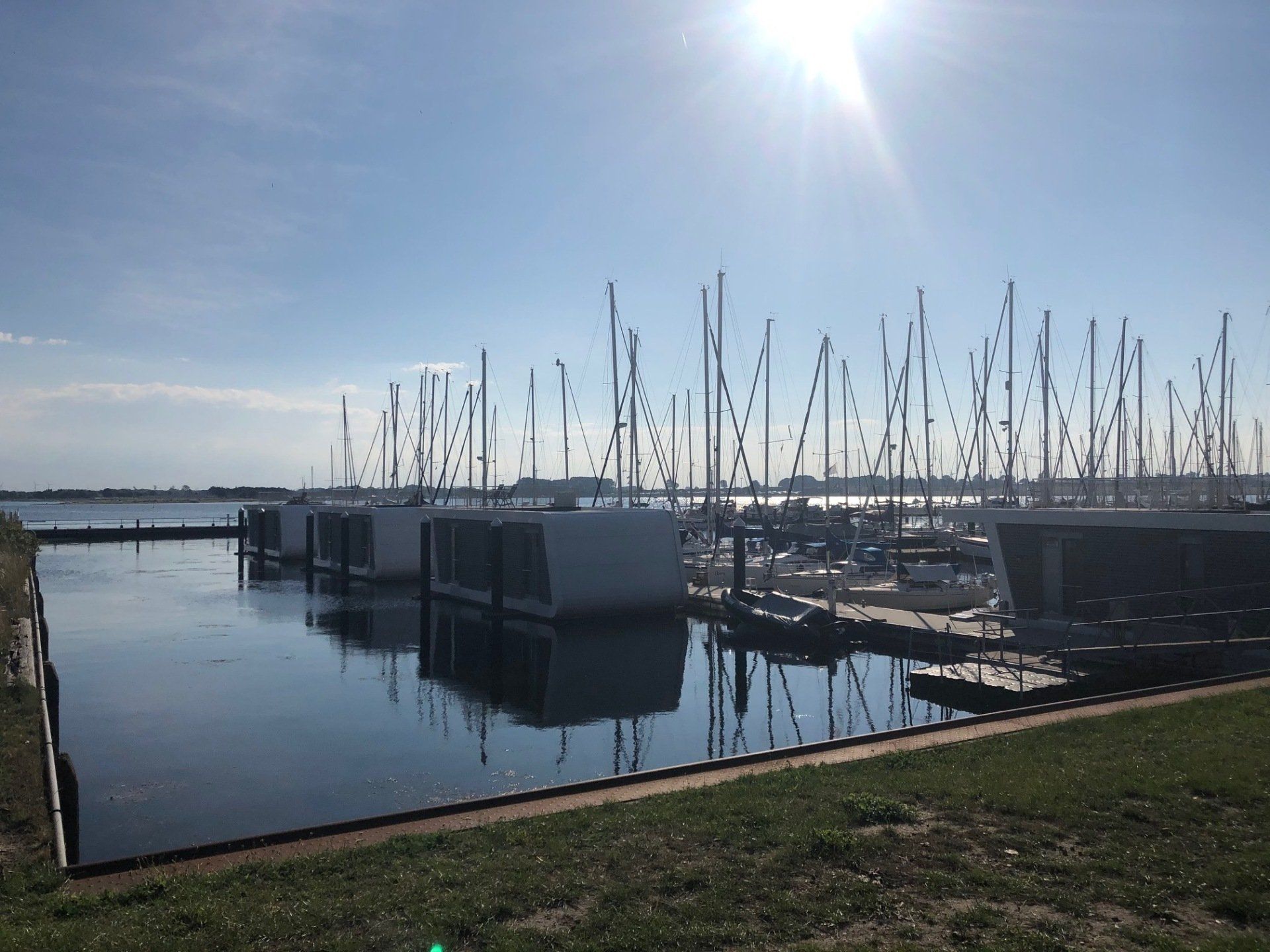 Die Mole in Großenbrode schafft ein geschütztes Stück Ostsee. Hier im Yachthafen liegt das schwimmende Ferienhaus "Heimathafen" für Ihren Urlaub auf dem Wasser - tanken Sie auf und wollen Sie Meer!